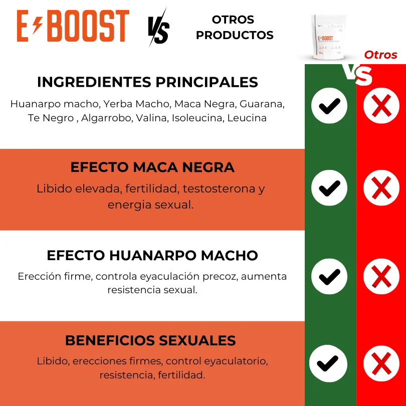 Porque E-BOOST no es un químico de efecto momentáneo, sino una fórmula completa que recupera tu energía, deseo y rendimiento desde dentro. Mientras otros productos sólo estimulan temporalmente, E-BOOST fortalece tu cuerpo, mejora tu circulación y potencia tu confianza día tras día.